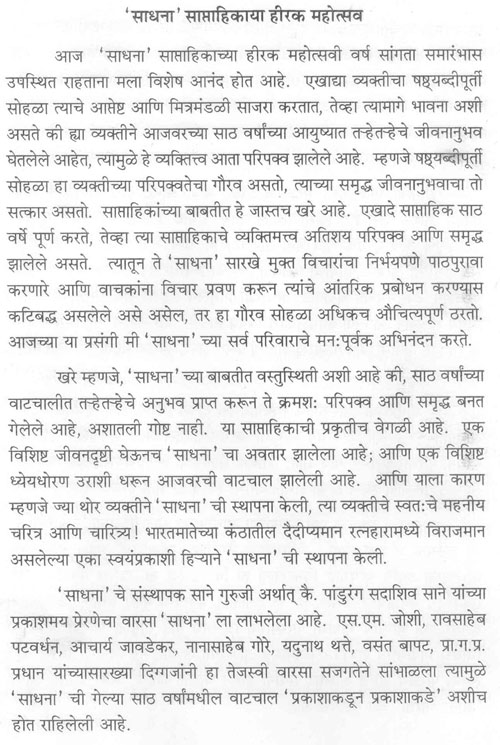 Speech by Her Excellency the President of India, Shrimati Pratibha Devisingh Patil, at the Diamond Jubilee Celebration of 60 Years of 'sadhana" Magazine at Pune