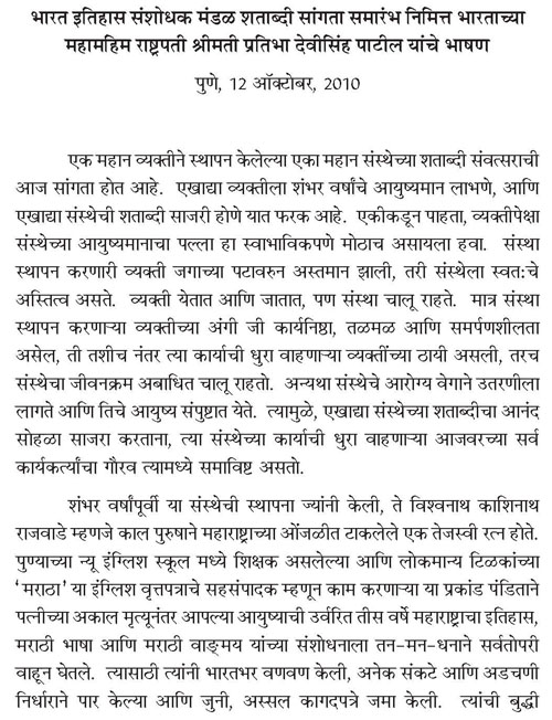 Speech by Her Excellency the President of India, Shrimati Pratibha Devisingh Patil at the Inauguration of the Centenary Celebrations of Bharat Itihas Samshodhak Mandal at Pune, Maharashtra