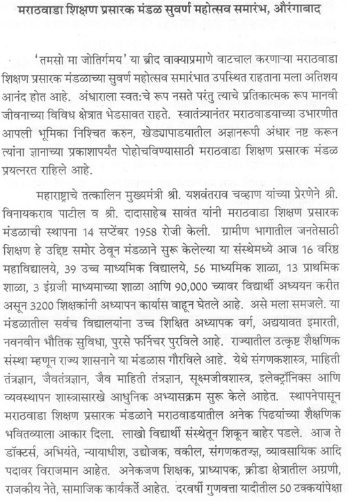 Speech by Her Excellency the President of India, Shrimati Pratibha Devisingh Patil, at the Inauguration of the Golden Jubilee of Marathwada Shikshan Prasarak Mandal at Aurangabad